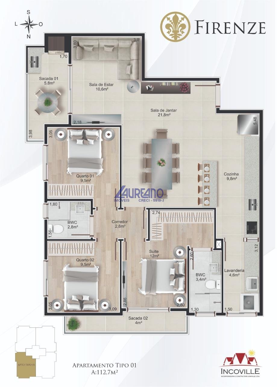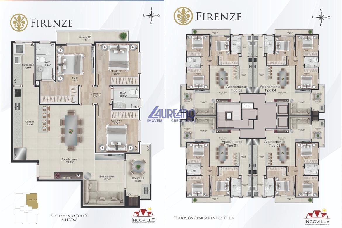 CONDOMINIO RESIDENZIALE FIRENZE INCORPORADO NA MATRICULA R-2- 156.914 APARTAMENTOS GIARDINO: (218 m2 úteis) APARTAMENTOS TIPO (1,2,3,4): (112 m2 úteis) 2 vagas de garagens por apartamento 3 quartos de casal, sendo uma suíte com closet e sacada Quartos fora da divisa dos apartamentos, proporcionando privacidade Sacada com churrasqueira a carvão, com sistema de fechamento hermético e exaustor individual, evitando cheiro e fumaça Sala, copa e cozinha integrados Banheiro social Lavanderia separada e espaçosa 4 Infraestruturas para Split Infraestruturas para água quente para todos os ambientes. Piso em porcelanato retificado (Fino acabamento) Áreas molhadas revestidas em azulejos (Fino acabamento) Rebaixo do teto em gesso em todo o apartamento. Banheiros: Com as torneiras do chuveiro em monocomando e vaso sanitário. Janelas com persianas. Flexibilidade para mudar o layout interno e acabamentos
