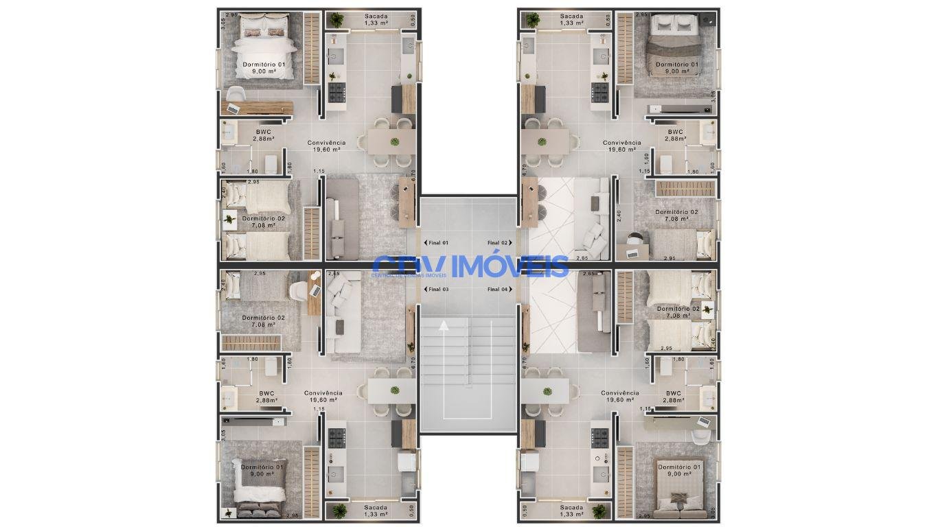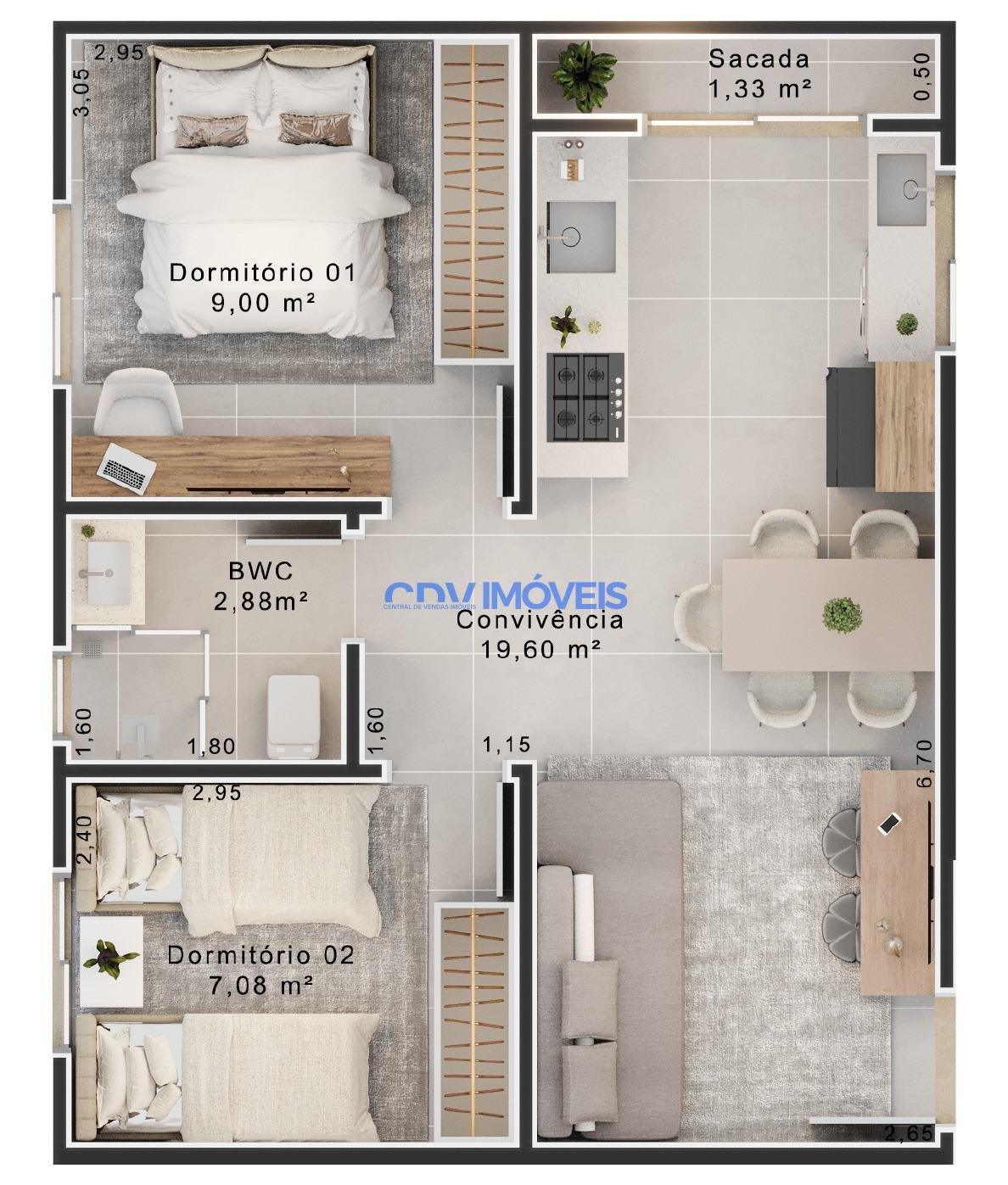 Infraestrutura 45,82 m² VAGA DE ESTACIONAMENTO 2 DORMITÓRIOS, SACADA, SALA E COZINHA INTEGRADAS, BANHEIRO SOCIAL, ÁREA DE SERVIÇO, 2 SALÕES DE FESTAS, PLAYGROUND, QUADRA ESPORTIVA, BRINQUEDOTECA, ACADEMIA, SALA DE JOGOS, PET PLACE, GUARITA.